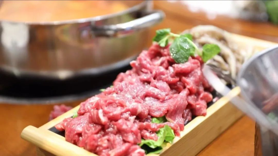 随着菜品上桌,食客们将切成薄片的雪花牛肉、毛肚放入沸腾的酸汤中,用筷子轻轻拨散,涮煮1~2分钟,此时牛肉口感鲜嫩爽滑,再配上辣椒蘸料,更是提味。